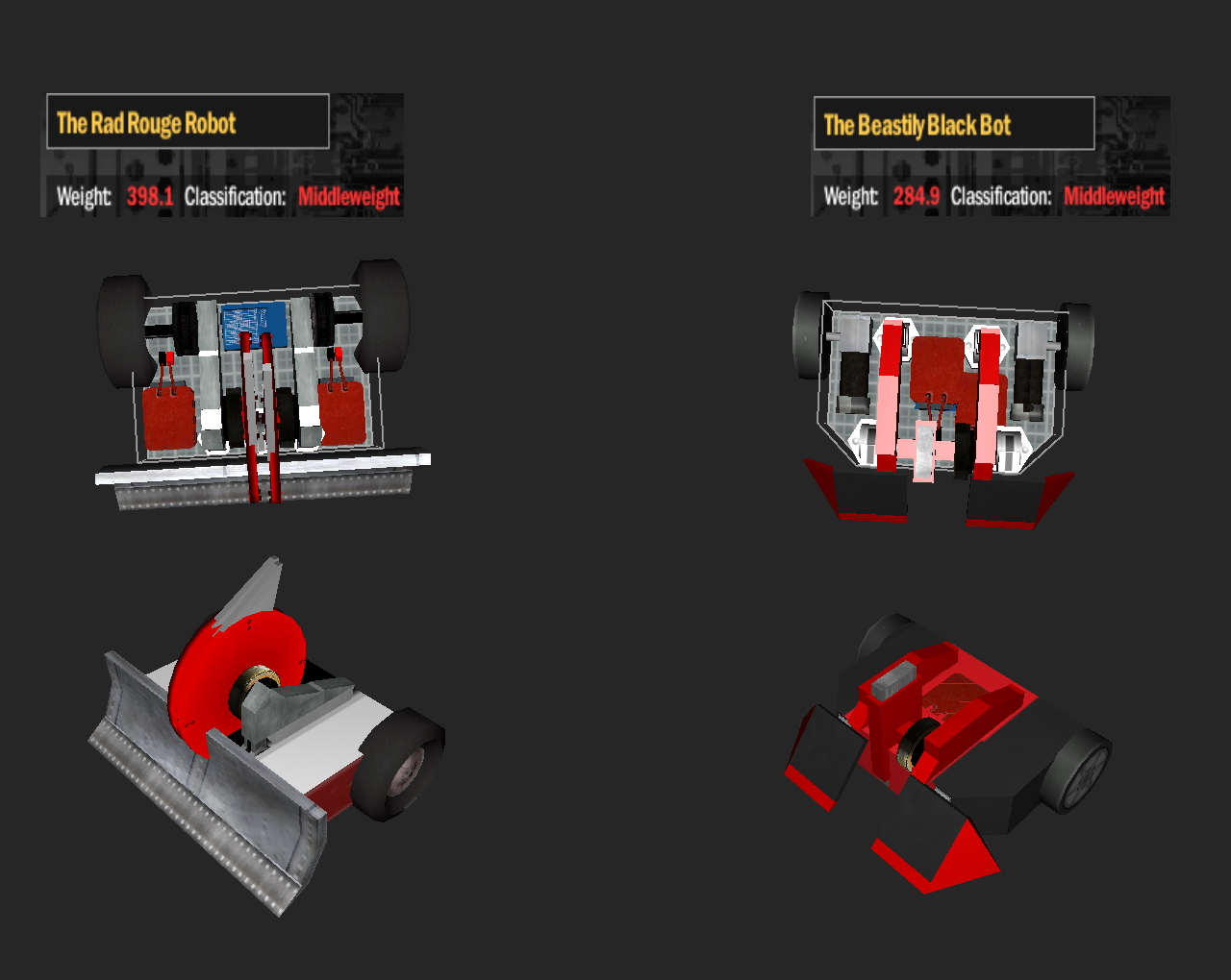 I really really like that first one. It's very simple but seems like a super cohesive bot. The plows are super underused too and you've managed to make it look great. Maybe lacking in drive power a bit though.