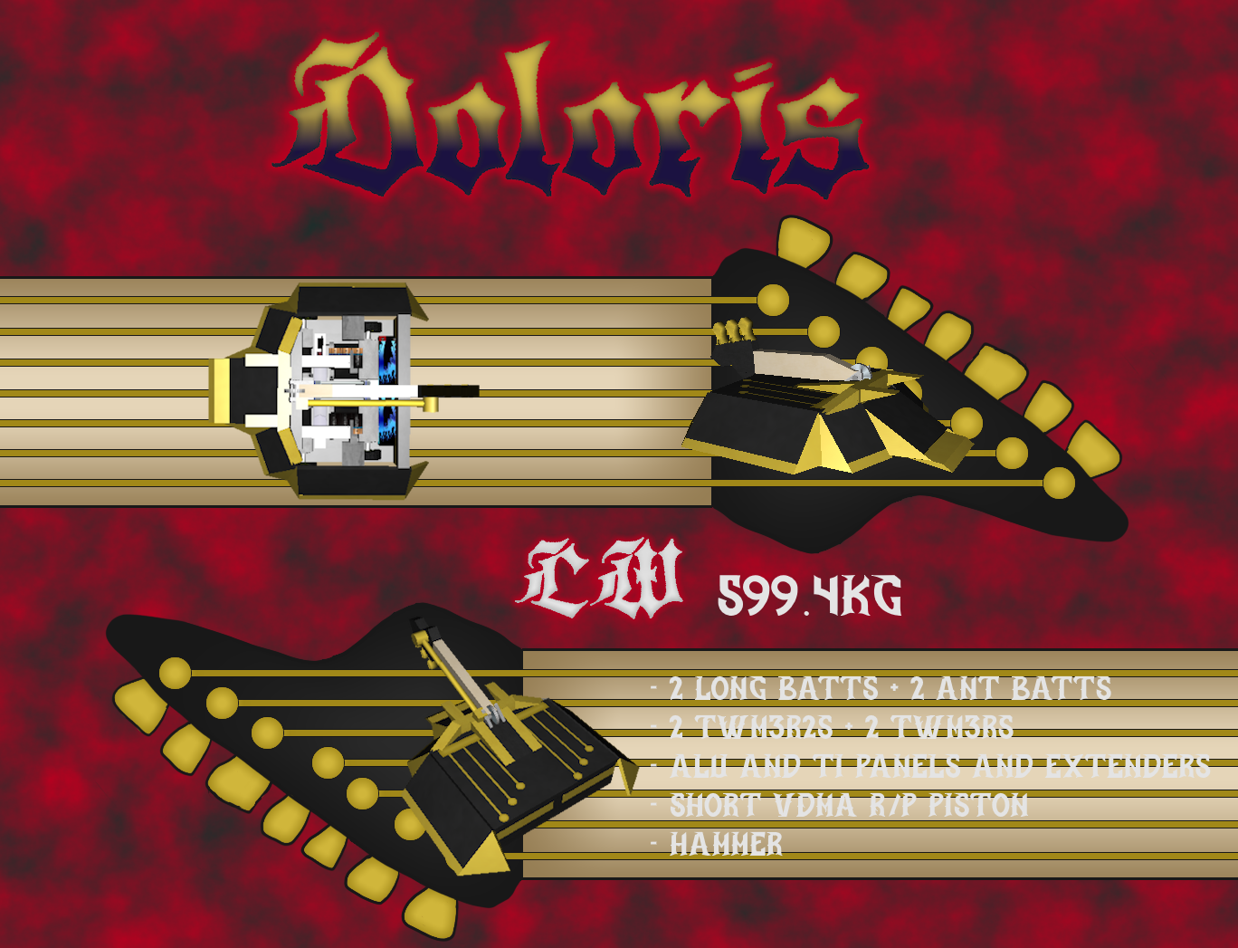 New robot built for samurai's academy in SSB. Doloris has a hammer shaped like the head of a guitar w/ strings too! I had hoped to make the strings on the main body out of the same parts as the one on the weapon but that's one of the things that weight issues meant I couldn't do, so was a shape that wouldn't be so easily doable w/ the ingame chassis maker. Looks wise I think great idea, but gimped by weight issues. Going forward I might make my future MWs and CWs OBJs then extenderbots be HW and up only.