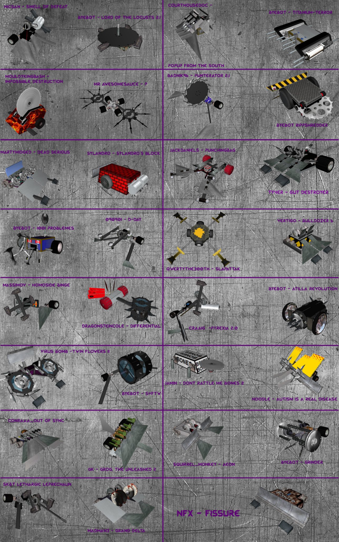 16 Bot bracket:Each heat starts as a 4 way melee. The first bot that gets KOed, immobilized, flipped OOTA or has the fewest points after the 3 minutes match time is up is pulled out and the fight gets restarted in a different arena with the 3 bots remaining. The last bot standing goes to round 2. In this case round 2 is the final since I plan to allow 16 entrants.